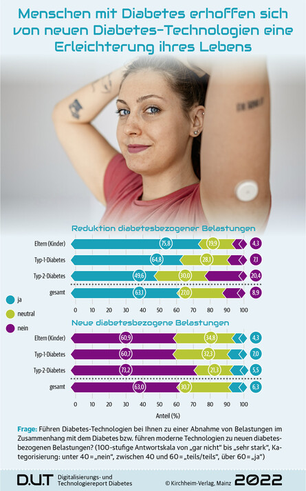 Der Einsatz neuer Diabetes-Technologien geht einher mit der Hoffnung, dass sie den Menschen das Leben mit der Erkrankung erleichtern. Am stärksten empfinden das Eltern von Kindern mit Diabetes: 75,8 Prozent von ihnen sehen eine Abnahme der Belastungen im Zusammenhang mit dem Diabetes. Und nur 4,3 Prozent spüren durch die Technologien neue diabetesbezogene Belastungen. Menschen mit Typ-1-Diabetes sehen sich zu 64,8 Prozent entlastet und 7,0 Prozent denken, dass die neuen Diabetes-Technologien sie eher belasten. Die teilnehmenden Menschen mit Typ-2-Diabetes empfinden im Vergleich die geringste Erleichterung, nämlich zu 49,6 Prozent, aber mit 5,5 Prozent auch eine geringere neue Belastung als Menschen mit Typ-1-Diabetes.