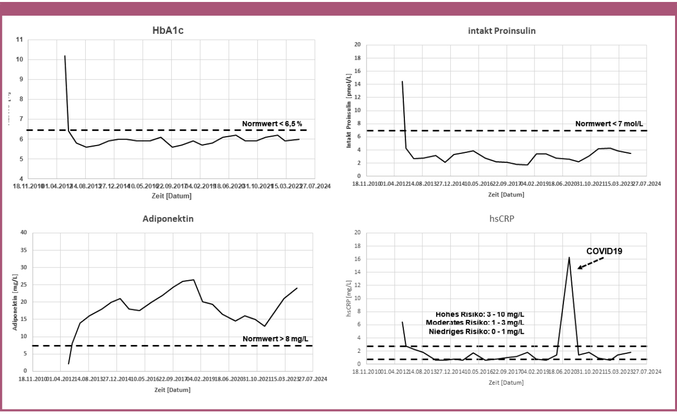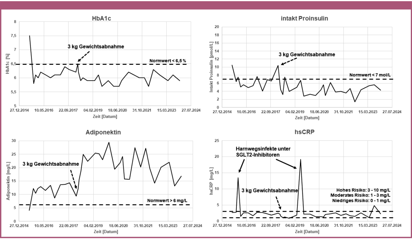 Unter dieser optimierten SOC+ Kombinationstherapie hat die Patientin seit über 11 Jahren eine stabile Diabeteseinstellung und keinen Hinweis für eine Diabetesprogression. In den ersten 6 Monaten nahm sie 5 kg ab (auf 89 kg/29,7 kg/m²); ein Effekt, der auch in den Folgejahren mit geringen Schwankungen kontinuierlich anhielt (aktuell im Oktober 2023: 72 kg/23,5 kg/m²). Im Herbst 2020 erkrankte die Patientin an einer SARS-CoV-2 Infektion mit schweren Grippesymptomen; ansonsten gab es keine gesundheitliche Probleme.