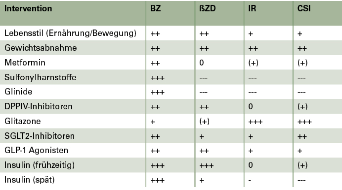 Tab. 1: Einfluss antidiabetischer Interventionen auf die pathophysiologischen diabetischen Grundstörungen (BZ: Blutzucker, ßZD: ß-Zelldysfunktion, IR: Insulinresistenz, CSI: chronisch systemische Inflammation)