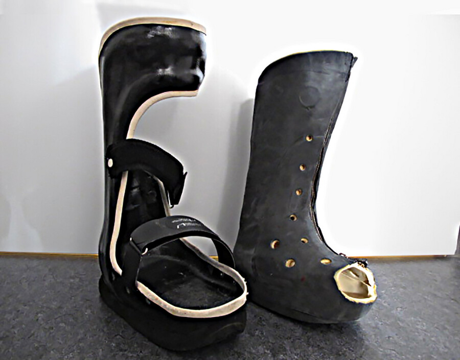 Ad 3: individuelle Anfertigung nach Abdruck und Vorgabe des vorhandenen Charcot-Fußes, in der Regel leicht und sicher anzulegen, insbesondere bei der Zweischalenorthese können Volumenschwankungen gut aufgefangen werden. Erfahrener Orthopädietechniker benötigt einige Tage zur Anfertigung und Auslieferung, nicht überall verfügbar, kann Fußdeformierungen und Achsabweichungen gut spiegeln und den Fuß stabilisieren, keine Grenze beim Körpergewicht. (Abb. 1 und Abb. 2)