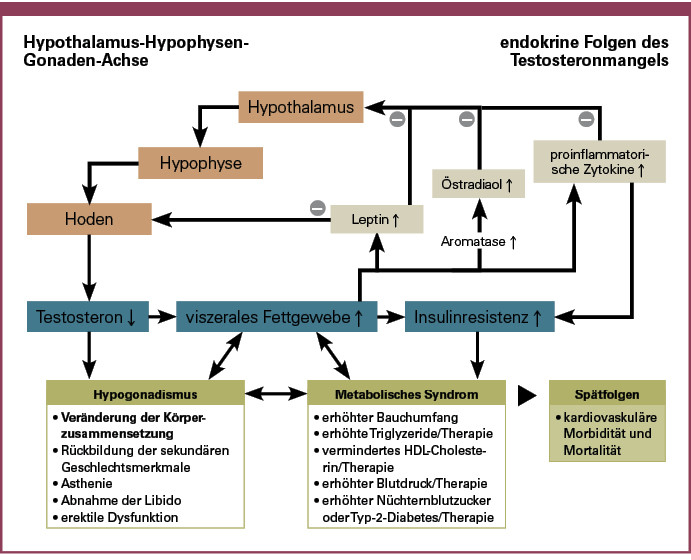 Bei über 70-jährigen Männern korrelieren niedrige Testosteronspiegel mit Insulinresistenz, und zwar unabhängig von zentraler Adipositas. Aktuelle Forschungsergebnisse deuten darauf hin, dass Testosteron an der Glukoseutilisation beteiligt ist, indem es Glukoseaufnahme, Glykolyse und mitochondriale oxidative Phosphorylierung stimuliert (12). Ebenso konnte gezeigt werden, dass Testosteron an der Lipidhomöostase in insulinsensitiven Geweben wie Leber, Fett und Skelettmuskulatur beteiligt ist. Ferner nimmt Testosteron Einfluss auf die Körperzusammensetzung, indem es die Bildung fettfreier Körpermasse stimuliert. Zwischen Testosteronkonzentration im Plasma und der Ausprägung von Insulinresistenz und viszeraler Fettmasse besteht wiederum eine inverse Korrelation (24 – 26). Wird bei hypogonadalen Männern Testosteron substituiert, kann die Leptinsekretion in den Adipozyten gehemmt und damit der Circulus vitiosus zwischen Leptinresistenz und Adipositas unterbrochen werden (25).
