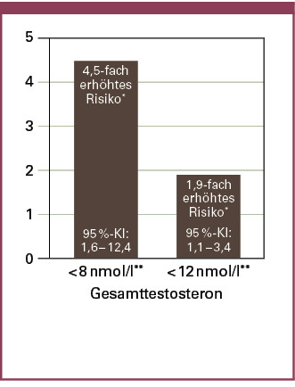Über den bekannten Zusammenhang von Testosteronmangel und erektiler Dysfunktion hinaus gibt es zunehmend auch Hinweise dafür, dass Testosteronmangel eine wichtige Rolle bei der Entstehung des Metabolischen Syndroms einschließlich Typ-2-Diabetes, Insulinresistenz und Adipositas (Abbildung 2) spielt (21). Auch in der deutschen, bevölkerungsbasierten Study of Health in Pomerania (SHIP) mit mehr als 1 300 Teilnehmern zeigte sich, dass Männer mit niedrigen Testosteronspiegeln ein erhöhtes Risiko für die Entwicklung eines Typ-2-Diabetes tragen (22). Bei Teilnehmern mit einem Gesamttestosteron < 12 nmol/l (3,46 ng/ml) war das Diabetesrisiko 1,9-fach erhöht und bei Werten < 8 nmol/l (2,31 ng/ml) sogar 4,5-fach (Abbildung 3) (22).