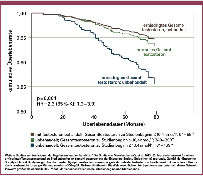 Eine Follow-up-Studie über einen Zeitraum von sechs Jahren verglich die Mortalitätsraten bei Diabetespatienten mit einem Gesamttestosteronwert > 10,4 nmol/l (n = 343) und denjenigen mit Werten ≤ 10,4 nmol/l (n = 238) (23). Diese Grenzwerte orientieren sich an der Clinical Practice Guideline der Endocrine Society von 2010 (11). In der Gruppe von Männern mit Konzentrationen ≤ 10,4 nmol/l war die Mortalitätsrate mit 17,2 % signifikant höher als bei den Teilnehmern mit höheren Testosteronwerten (9 %; p = 0,003) (23). Damit war das Testosterondefizit mit einer Verdoppelung der Gesamtmortalität assoziiert (23).