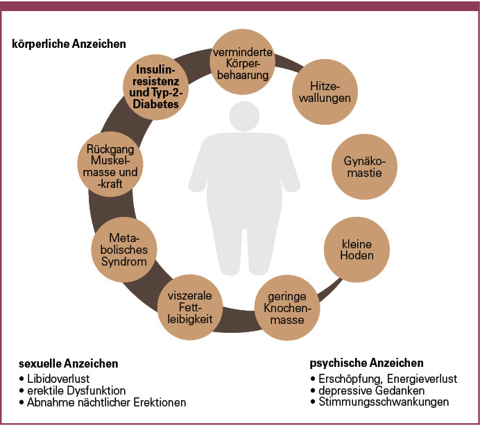 Beim Hypogonadismus des Mannes handelt es sich definitionsgemäß um ein klinisches und biochemisches Syndrom, das durch ein Testosterondefizit und relevante klinische Symptome charakterisiert ist. Von dieser mit steigendem Alter und Begleiterkrankungen assoziierten endokrinen Funktionseinschränkung können unterschiedliche Organsysteme betroffen sein. Dies kann deutliche Beeinträchtigungen der Lebensqualität mit Veränderungen der Sexualfunktion und anderen charakteristischen Symptomen wie Gewichtszunahme, Abnahme der Muskulatur, Osteoporose, Störungen der Gedächtnisleistung oder Depressionen nach sich ziehen (5).