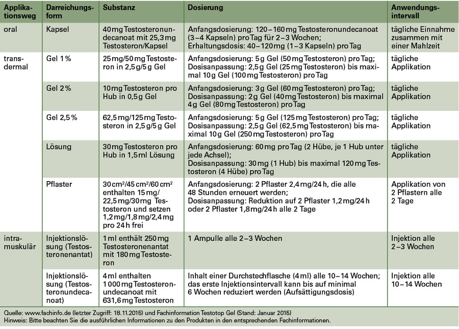 Zur Substitutionstherapie werden Präparate mit natürlichem Testosteron empfohlen, verfügbar sind Zubereitungen zur intramuskulären, subdermalen, transdermalen, oralen und bukkalen Anwendung (4, 10, 11). In der Initialphase einer Substitutionstherapie wird kurzwirksamen Zubereitungen im Vergleich mit langwirksamen Präparaten der Vorteil zugeschrieben, dass die Behandlung bei Bedarf kurzfristig beendet werden kann. Eine Übersicht über die derzeit in Deutschland verfügbaren Anwendungsformen gibt Tabelle 1.