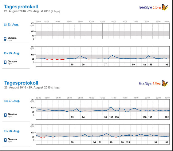 Dr. Thomas Werner: Das war schon seltsam. Die Schwankungen über den Tag sind auch bei Nichtdiabetikern zu beobachten. Ich hatte über die Nacht häufig sehr niedrige BZ-Werte. Außer nach einer Pizza. Da blieb es die ganze Nacht etwas höher. Das ist auch bei unseren Patienten in Bad Lauterberg ein beliebter Abschlusstest: Wie bewältigt meine neue BZ-Einstellung eine Pizza? Ich weiß jetzt, von was wir reden.