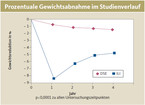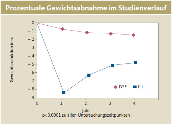 Die Gewichtsabnahme war im ersten Jahr dramatisch (–8,6 % des Körpergewichtes vs. –0,7 %, Abb. 1), ging in den Folgejahren etwas zurück (Jahr 2: –6,4 %, Jahr 3: –5,1 %, Jahr 4: –4,7 %), lag aber nach vier Jahren immer noch unter dem Ausgangsgewicht und um 3,6 Prozentpunkte besser als die Kontrollgruppe, wie Rena Wing stolz hervorhob.