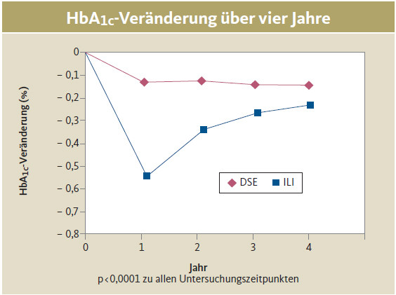 - Auch am HbA1c zeigte sich im ersten Jahr der deutlichste Erfolg, es lag um 0,64 % niedriger, nach vier Jahren betrug der Unterschied zur Kontrollgruppe nur noch 0,2 %.
