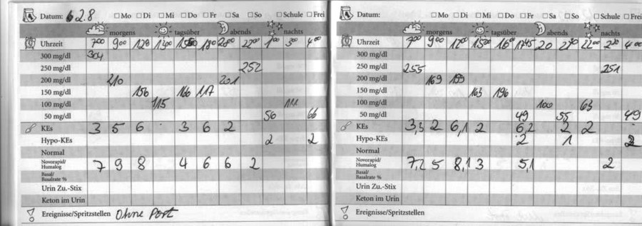 Die Gesamt-Basalrate liegt derzeit bei 6,85 IE/d mit starker zirkadianer Variabilität, die Essens-Boli ganztags bei 1E/KE. Die Häufigkeit der berichteten Hypoglykämien (BZ < 60 mg/dl, < 3,3 mmol/l) sank unter CIPII von 20/Monat auf 6 – 8/Monat. Die allgemeine Entwicklung des Jungen ist bei deutlich stabilisierten BZ-Verläufen erfreulich. Seit Implantation des Diaport kam es zu keinen schweren Hypoglykämien oder Ketoazidosen, keinen Katheterverschlüssen.