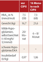 Der Junge hat bei begonnener Pubertät inzwischen von 16,7 kg auf 21,6 kg zugenommen (BMI 14 kg/m²). Der HbA1c blieb stabil mit 7,5 % (58 mol/mmol) vor CIPII-Beginn und 7,3 % (61 mol/mmol) 16 Monate danach. Der Insulin-Bedarf stieg unter CIPII von 0,97 U/kg auf 1,06 U/kg.