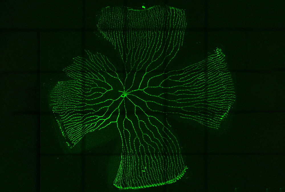 © UMM | Die retinalen Blutgefäße (grün) in einem erwachsenen Zebrafischauge.