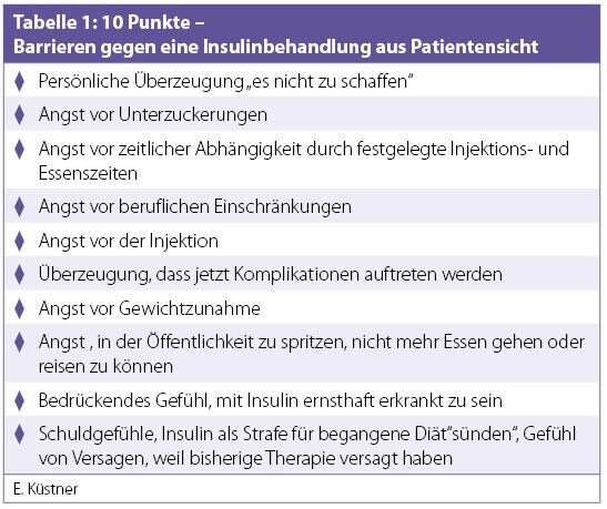 Wie aus der Tabelle "Barrieren" zu sehen ist, gehört auch die Insulininjektion selbst zu den anfänglichen Ängsten, die man berücksichtigen sollte (Tab. 1).