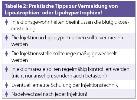 Obwohl sich in den letzten Jahren die Injektionsgewohnheiten und insbesondere die Verwendung von längeren Nadeln wie 12- oder 10-mm-Nadeln zugunsten von 8-, 6-, 5- oder 4-mm-Nadeln geändert haben, scheint es doch nach wie vor eine große Zahl von Betroffenen zu geben, denen nicht klar ist, dass es nicht egal ist an welcher Stelle des Körpers in die Haut injiziert wird, wie lang die Nadel ist und dass die Nadeln Einmalartikel sind. Die neueren sehr kurzen Nadeln stellen "High-Tech-Produkte" dar, die an der Spitze einen Mehrfachschliff und auch eine Beschichtung haben, die bereits nach der ersten Injektion "abgeschilfert" ist. So kann es bei jeder weiteren Injektion mit derselben Nadel zu Verletzungen kommen. Dadurch sind auch die schon früher festgestellten "unerklärlichen Blutzuckerschwankungen" und Lipohypertrophien zu erklären.