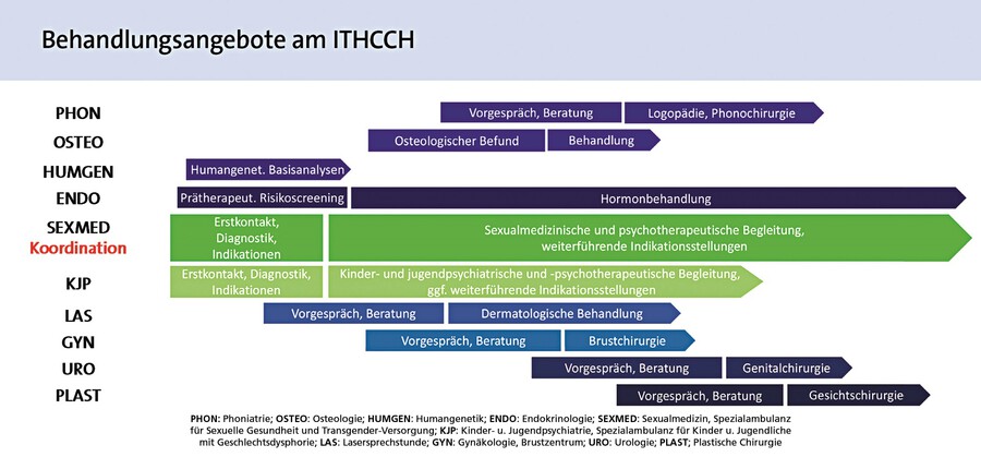 Im Interdisziplinären Transgender Versorgungscentrum des Universitätsklinikums Hamburg-Eppendorf (ITHCCH) arbeiten 11 medizinische Fachdisziplinen in der Trans-Gesundheitsversorgung zusammen. Erwachsene trans Personen stellen sich zunächst in der Spezialambulanz für Sexuelle Gesundheit und Transgender Versorgung vor, Jugendliche in der Spezialsprechstunde für Geschlechtsidentität. Im Rahmen der psychotherapeutischen Begleitbehandlung erfolgt eine Diagnostik und die gemeinsame Planung des individuellen Transitionsweges. Angestrebte somatische Behandlungen können hier indiziert und im Kontakt mit den somatischen Fachdisziplinen koordiniert werden. Zudem können allgemeine Maßnahmen der Gesundheitsversorgung über das ITHCCH in Anspruch genommen werden.