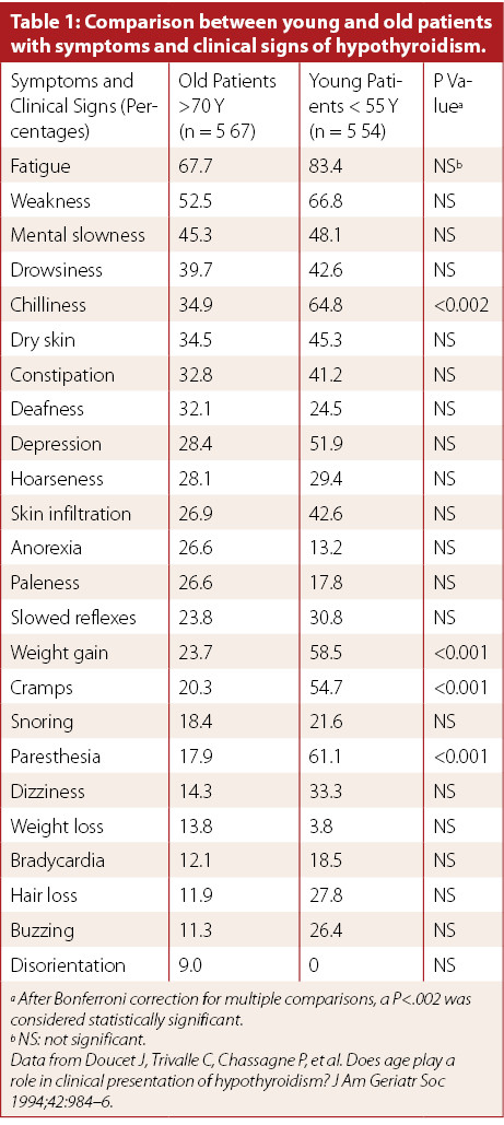 Die Hypothyreose im Alter ist signifikant symptomärmer und im Vergleich zu der Hypothyreose bei jungen Menschen steht signifikant häufiger die allgemeine körperliche Schwäche im Vordergrund des klinischen Bildes (Doucet J et al. JAmGeriatrSoc. 1994 / Tab. 1).