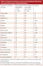Die Hyperthyreose junger Menschen ist signifikant symptomreicher als die Überfunktion der Schilddrüse bei älteren Mitbürgern. Gewichtsverlust und Vorhofflimmern werden bei älteren Patienten signifikant häufiger bei einer Hyperthyreose beobachtet (Trivalle C et al. JAmGeratrSoc. 1996). Die gleichen Autoren konnten interessanter Weise zeigen, dass die Wärmeintoleranz bei hyperthyreoten älteren Menschen im Vergleich zum jungen hyperthyreoten Kollektiv so gut wie keine Rolle (Unterschied p < 0.001) spielt (Tab. 2).