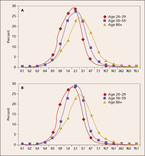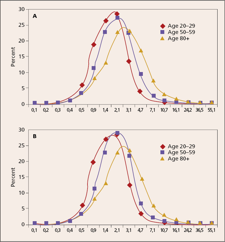 Als Ursache der altersbedingten Veränderungen von TSH wird einerseits eine verminderte TSH-Sekretion, zum anderen ein verändertes Ansprechen der Hypophyse auf niedrige fT4-Werte diskutiert. Surks MI et al. (JCME 2007) konnten diese Veränderungen entsprechend den unterschiedlichen Altersklassen bei gesunden Probanden quantifizieren (Abb 1).
