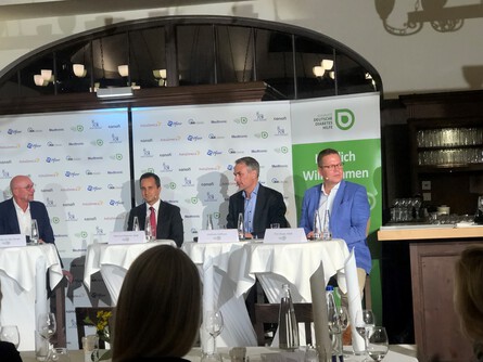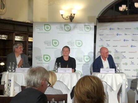 Das Podium bei der gesundheitspolitischen Diskussion, zu der diabetesDE – Deutsche Diabetes-Hilfe eingeladen hatte (Dr. Jens Kröger, Tina Winklmann, Moderator Wolfgang van den Bergh (v.l.n.r.).