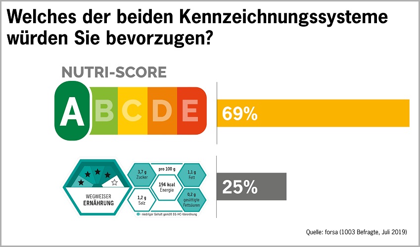 Die Mehrheit der Deutschen spricht sich für eine Kennzeichnung von Lebensmitteln mit der Nährwertampel Nutri-Score aus – das ist das Ergebnis einer repräsentativen Umfrage des Forsa-Instituts im Auftrag mehrerer medizinisch-wissenschaftlicher Organisationen und der Verbraucherorganisation foodwatch. 69 Prozent der befragten Personen bevorzugten den Nutri-Score gegenüber dem von Bundesernährungsministerin Julia Klöckner in Auftrag gegebenen Kennzeichnungsmodell „Wegweiser Ernährung“.