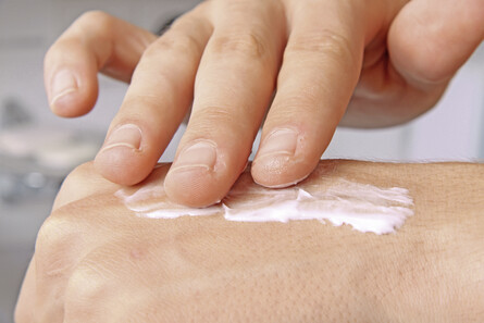 - Abtrocknen: Vorsichtig tupfend, keinesfalls frottierend abreiben, anschließend ein Hautpflegemittel auftragen. Ziel ist Ersatz bzw. Ergänzung des instabilen Hydrolipidfilms, um die Wasserbindung