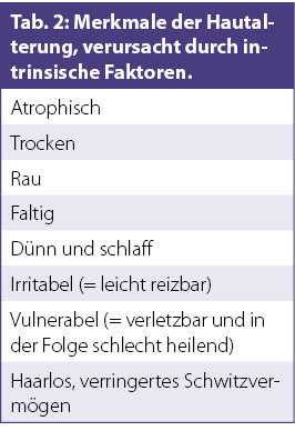 Minderung der Epidermis, Verlust elastischer Fasern, nur noch geringer Anteil an Hyaluronsäure und Abnahme des subkutanen Fettgewebes machen sie verhältnismäßig weit, dünn, schlaff und leicht verletzlich (Abb. 1). Der Hautturgor nimmt ab. Die Faltenbildung wird durch die Degeneration kollagener Fasern (= Umbau in pathologisches, nichtfunktionelles Bindegewebe) begünstigt. Sie nimmt an Stellen zu, die dem Licht besonders ausgesetzt sind. Intrinsische – also vom Körper ausgehende – Faktoren der Hautalterung führen zu den in Tab. 2 aufgeführten Merkmalen des Hautzustands.