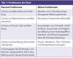 3. Subcutis (Unterhaut): Ein lockeres Bindegewebe, in das neben Blutgefäßen und Nerven vor allem traubenförmige Fettzellhaufen eingelagert sind. Sie verbindet sich in der Tiefe mit den Körperfaszien der Muskeln bzw. der Knochenhaut. Die passiven und aktiven Funktionen der Haut (Tab. 1) schützen den Körper z.B. vor Verletzungen, Wärme- und Wasserverlust, Druck und Infektionen. Diese Schutzfunktionen sind erst mit Abschluss der Pubertät vollständig ausgeprägt.
