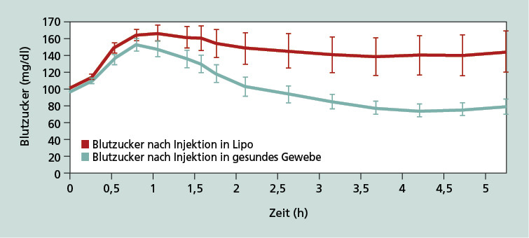 ImVergleich zur Insulininjektion in gesundes Gewebe resultierte die Injektion in Lipos in beträchtlich höheren postprandialen Blutzuckerkonzentrationen. Die Autoren der Studie kamen zu der Schlussfolgerung, dass Insulininjektionen in Lipos die Insulinabsorption reduzieren und zu einer schlechteren Blutzuckereinstellung nach den Mahlzeiten führen.