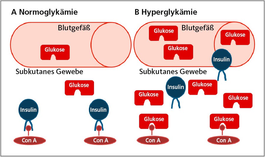 Ein weiterer Ansatz zur Glukose adaptierten Insulintherapie besteht in der Entwicklung von subkutanen Insulinformulierungen, welche in Abhängigkeit von der interstitiellen Glukosekonzentration Insulin freisetzen und somit glukoseabhängig wirken. Das Grundprinzip verschiedener molekularer Technologien besteht grundsätzlich ist einer Kopplung des Insulins an verschiedene Trägersubstanzen aus denen das Insulin in Anhängigkeit von der umgebenden Glukosekonzentration freigesetzt wird (Abbildung 3).
