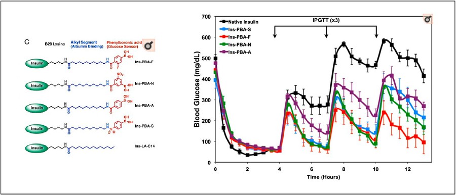 Durch Verwendung verschiedener Phenylboronsäure-Konjugate (PBA-F; PBA-N, PBA-A, PBA-S) können Insuline mit unterschiedlichen Glukoseschwellen zur Freisetzung des Insulins geschaffen werden (Abbildung 4). Als Nachteil dieser Technologie muss die fehlende Spezifität für Glukose erwähnt werden. So führt bei dieser Technologie auch ein Fruktose Anstieg zu einer Freisetzung des Insulins aus der Albuminbindung.