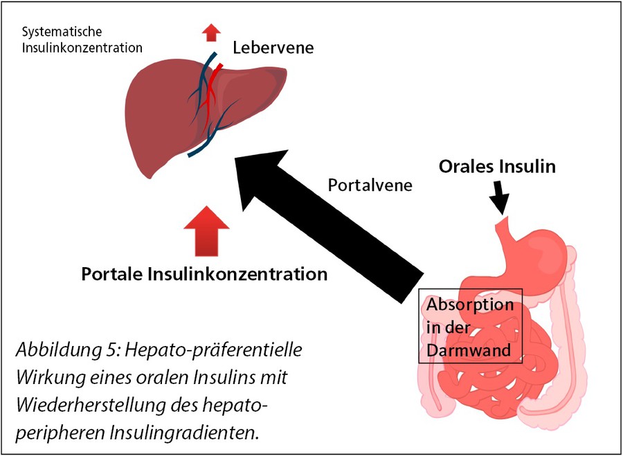 Seit Jahrzehnten wird an Insulinen geforscht, die über alternative Zugangswege appliziert werden können. So wurden Insuline für orale, pulmonale, transdermale, intranasale, okulare, vaginale und rektale Zugangsrouten entwickelt (1, 15). Neben der komfortableren Applikation eröffnet die orale Insulinzufuhr mit der damit verbundenen gastrointestinalen Aufnahme in das Pfortadersystem Vorteile einer hepato-präferentiellen Wirkung dieser Insulinformulierungen (Abbildung 5).