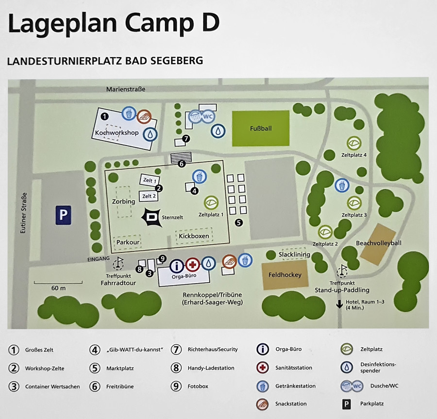 Nach der Ankunft wurden die knapp 300 Zelte von den Betreuern und Mitarbeitern von Novo Nordisk aufgebaut. Anschließend bekamen die Betreuer ein ausführliches „Briefing“ bzgl. Ablauf der nächsten Tage, Zeltplatzordnung, Aufgaben und Verpflichtungen. Großen Wert wurde auf die „Selbstverpflichtung zur Prävention vor sexueller Gewalt“ gelegt, welche den Umgang zwischen Betreuern und Teilnehmern regelt. Zum Abschluss des Tages gab es ein großes Grillbuffet, es wurden keine Kosten gescheut. Die Teilnehmer reisten einen Tag später an.