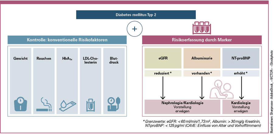 Bei auffälligen Biomarkern (siehe Abb. 1) sollte der Patient zügig und mit Priorität zu den entsprechenden Spezialisten geschickt werden, z. B. für Echokardiographie, Belastungs-Untersuchungen, Koronarangiographie oder aber auch zur weiteren nephrologischen Abklärung. Parallel dazu sollte eine konsequente und evidenzbasierte Therapie der bekannten kardiovaskulären Risikofaktoren wie Hypertonie, Dyslipidämie und Hyperglykämie erfolgen [Buse 2020, Cosentino 2020, Davies 2018].