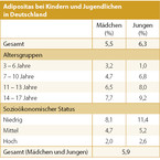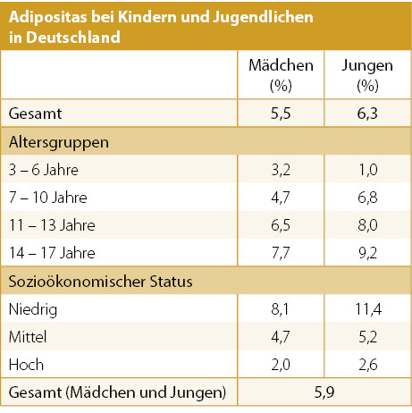 Adipositas haben 3,2 % der 3- bis 6-jährigen Mädchen und 1,0 % der Jungen dieser Altersgruppe. Auch diese Zahlen steigen im Lebensverlauf weiter an: auf 7,7 % bei den 14- bis 17-jährigen Mädchen bzw. auf 9,2 % bei den Jungen (siehe Tabellen).