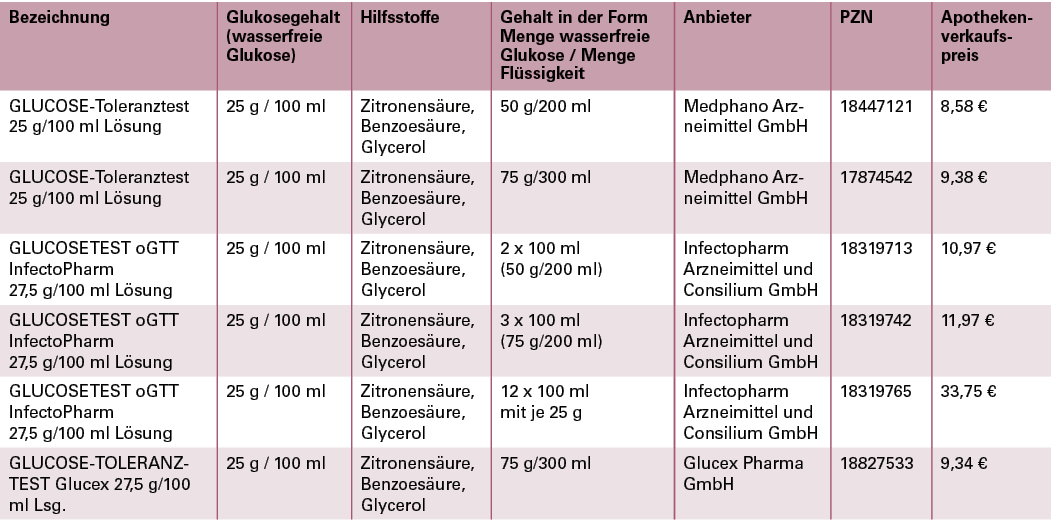 Tabelle 1: Aktuell auf dem deutschen Markt verfügbare Fertigglukoselösungen für den oGTT (Stand 15.07.2024)