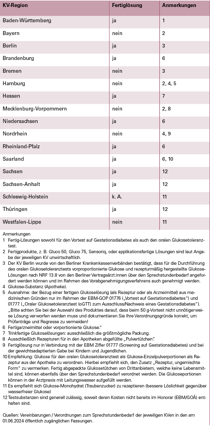 In zehn von 17 Bereichen der Kassenärztlichen Vereinigungen (KVen) kann die oGTT- Lösung als Sprechstundenbedarf nach den angegebenen Voraussetzungen verordnet werden (Tabelle 2). Die Gründe für die Unterschiede zwischen den KVen sind nicht transparent.