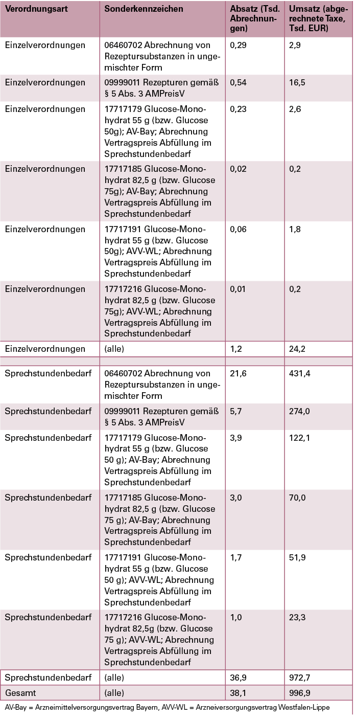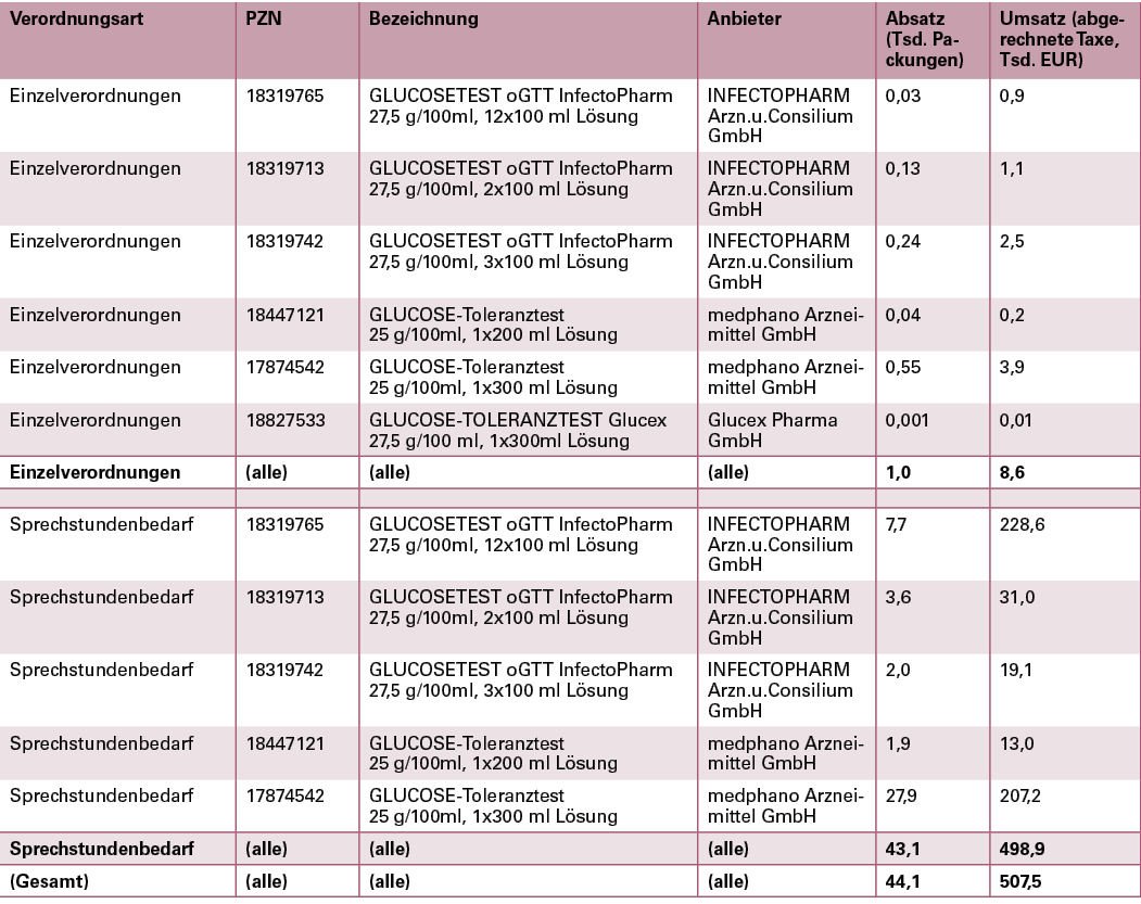 Es gilt zu beachten, dass in der Tabelle 1 keine Glukosepulver oder Lösungen aufgelistet sind, die am Markt sind und in Praxen verwendet werden, aber nur als nicht zulassungsfähige Lebensmittel oder Nahrungsergänzungsmittel im Handel sind. Nur zugelassene, apothekenpflichtige Arzneimittel sind abrechenbar, nicht jedoch diätetische Lebensmittel, auch wenn diese über eine PZN verfügen.