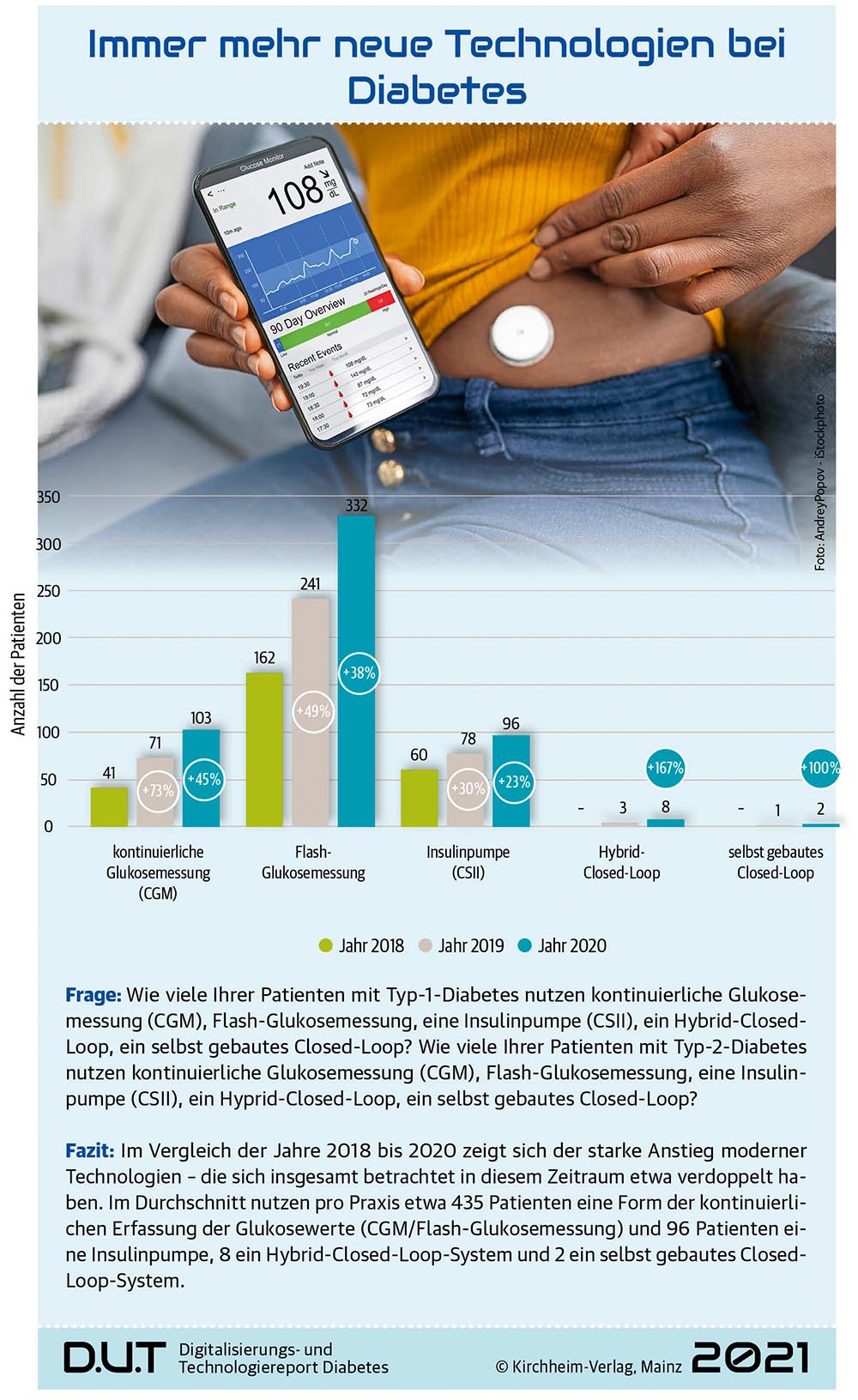 Zum dritten Mal in Folge wurden auch im Jahr 2020 diabetologisch tätige Ärzte für den Digitalisierungs- und Technologiereport Diabetes (D.U.T-Report) zur Digitalisierung und zur Anwendung neuer Technologien in der Diabetologie befragt. Die zusammenfassende Betrachtung der Umfrageergebnisse der letzten drei Jahre ermöglicht einen Vergleich, der zeigt, dass sich im Zeitraum von 2018 bis 2020 die Anzahl der Menschen mit Diabetes, die moderne Technologien in ihrer Therapie anwenden, mehr als verdoppelt hat und die meisten Diabetologen in ihrer Praxis täglich mit digitalen Anwendungen und neuen Technologien umgehen.