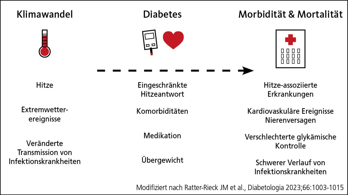 Durch den Klimawandel kommt es bereits heute zu einem Anstieg der durchschnittlichen Umgebungstemperatur und einer vermehrten Anzahl von Hitzewellen. Menschen mit Diabetes haben eine veränderte physiologische Antwort auf Hitze und gehören deshalb neben Säuglingen und älteren Menschen zu den Personen, deren Gesundheit durch Hitze besonders gefährdet ist. Die physiologische Antwort auf Hitze – periphere Vasodilatation, sowie vermehrte Schweißsekretion zur Regulation der Körpertemperatur – ist sowohl bei Menschen mit Typ-1- als auch bei solchen mit Typ-2-Diabetes gestört. Schon früh nach der Diagnose zeigen Menschen mit Typ-1-Diabetes einen verminderten Blutfluss in der Haut, sowie eine verminderte Schweißsekretion, vor allem in der unteren Körperhälfte. Auch Menschen mit Typ-2-Diabetes haben eine reduzierte Schweißsekretion, welche u.a. durch eine verminderte Innervation von Schweißdrüsen verursacht wird. Zu den Faktoren, die eine eingeschränkte Hitzeantwort bedingen, gehören neben der Diabetes-Dauer eine schlechte glykämische Kontrolle und das Vorhandensein einer peripheren Neuropathie. Menschen mit Diabetes, die ein hohes Alter oder Begleiterkrankungen wie eine eingeschränkte Nierenfunktion und kardiovaskuläre Erkrankungen aufweisen, sind dabei besonders durch Hitze gefährdet.