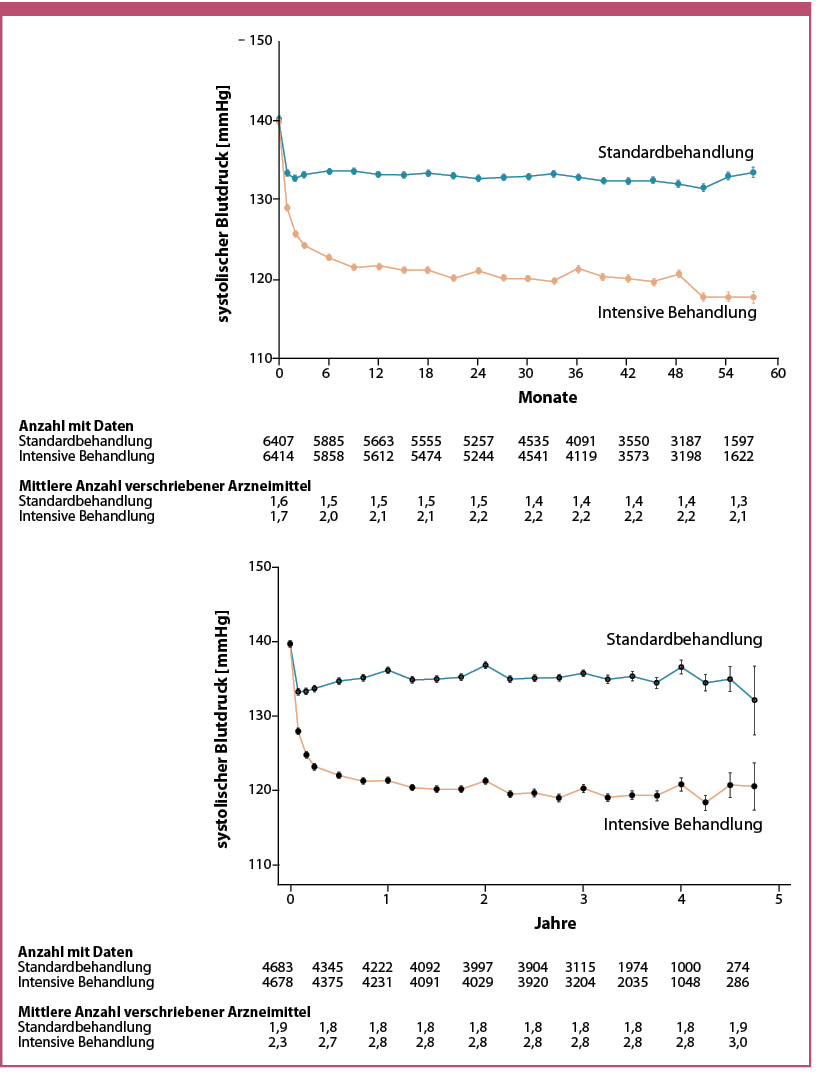 Nach einem Jahr lag der mittlere systolische Blutdruck im intensivierten Behandlungsarm bei 121,6 mmHg (Median 118,3 mmHg), und im standardmäßigen Behandlungsarm bei 133,2 mmHg (Median 135,0 mmHg). Während des mittleren Follow-up von 4,2 Jahren traten bei 393 Patienten im intensivierten Behandlungsarm primäre Endpunktereignisse auf (1,65 Ereignisse pro 100 Personenjahre), und bei 492 Patienten im standardmäßigen Behandlungsarm (2,09 Ereignisse pro 100 Personenjahre) (Abbildung 3; Hazard Ratio 0,79; 95 %-Konfidenzintervall 0,69 – 0,90; p < 0,001). Wiewohl die Inzidenz ernsthafter Nebenwirkungen in beiden Gruppen gleich war, traten symptomatische Hypotonie und Hyperkaliämie häufiger im intensivierten Behandlungsarm auf.