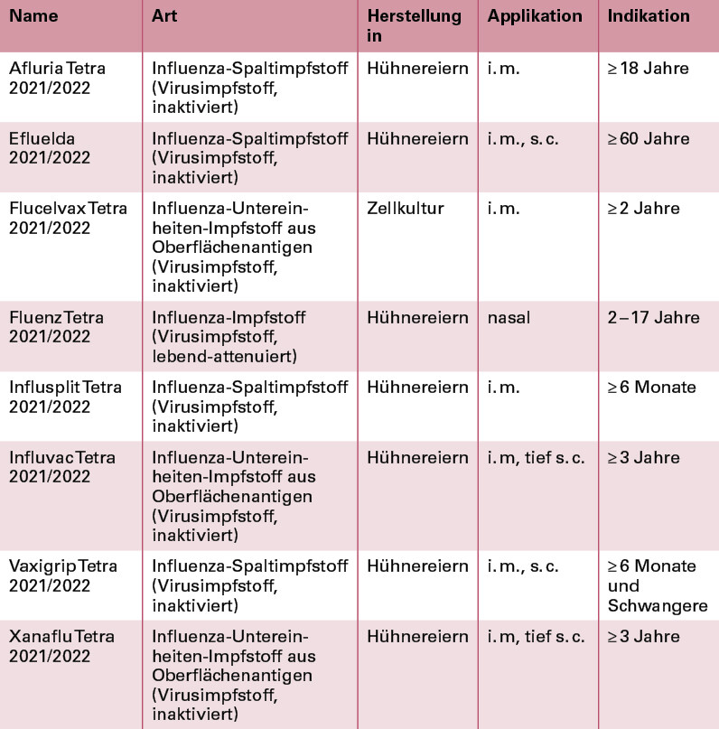 Für Kinder und Jugendliche kann (insbesondere bei Spritzenangst) ein nasal zu verabreichender Lebendimpfstoff eingesetzt werden, der für das Alter von 2 bis 17 Jahren zugelassen ist (Fluenz Tetra, AstraZeneca). Alle anderen Impfstoffe werden subkutan (s. c.) oder intramuskulär (i. m.) verabreicht und sind für verschiedene Altersstufen und Indikationen zugelassen.
