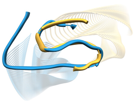 Querschnitte der 3D-Modelle der sogenannten Protofilamente von IAPP- und Aβ-Amyloidfibrillen. Die Überlagerung einzelner IAPP- und Aβ-Moleküle zeigt die Ähnlichkeit der S-förmigen Faltungen.