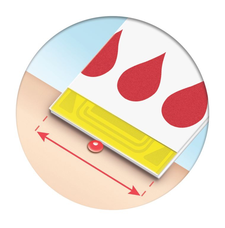 Eine weitere Erleichterung, wenn es im Alltag schnell gehen muss, im Fall einer Hypoglykämie oder auch wenn im Alter die motorischen Fähigkeiten nachlassen: die neuen Teststreifen mit der besonders breiten Blutauftragsfläche. Diese erstreckt sich nun über die gesamte Breite des Streifens und sorgt dafür, dass jeder Tropfen sitzt. Besonders angenehm für Patienten: Das Blut kann sogar schräg aufgetragen werden und das bei der gewohnt geringen Blutmenge. Lästiges Nachdosieren oder ein Verschwenden von Teststreifen durch Fehlversuche gehören damit der Vergangenheit an.
