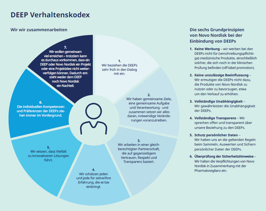 Im neuen deutschen DEEP-Netzwerk engagieren sich die DEEP-Mitglieder, kurz DEEPs, zukünftig zusammen mit Novo Nordisk für eine stärkere Wahrnehmung der Bedürfnisse und Wünsche der Betroffenen – sowohl im Unternehmen selbst als auch in der Öffentlichkeit. Die Zusammenarbeit basiert auf einem gemeinsam entwickelten Selbstverständnis, das den Dialog auf Augenhöhe sowie die Unabhängigkeit der im DEEP-Netzwerk engagierten Patientinnen und Patienten sicherstellt.