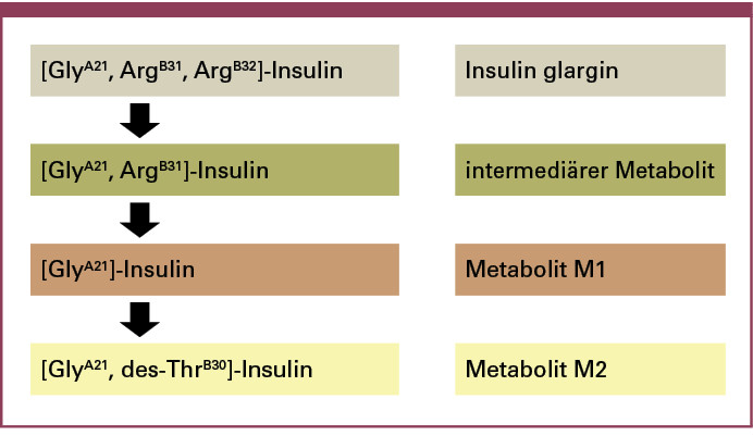 Als erstes im Markt verfügbares langwirkendes Insulinanalogon hat Insulin glargin (Lantus®, Abasaglar®) über viele Jahre den Standard der Basalinsulintherapie für Patienten mit Typ-1- und Typ-2-Diabetes geprägt. Dieses Insulinanalogon ist charakterisiert durch zwei zusätzliche Arginine am C-terminalen Ende der B-Kette sowie einem Austausch von Asparagin durch Glycin in Position 21 der A-Kette. Insulin glargin liegt in einer sauren Lösung zur Injektion vor. Nach Injektion des Insulins ins pH-neutrale subkutane Gewebe kommt es zur Ausbildung amorpher Präzipitate. Aus diesen Präzipitaten werden die einzelnen Insulinmoleküle im Vergleich zu NPH-Formulierungen deutlich langsamer in die Blutbahn aufgenommen. Bereits im subkutanen Gewebe und in der Blutzirkulation wird Insulin glargin schnell in die stoffwechselaktiven Metaboliten M1 und M2 gespalten, wobei M1 den für die blutzuckersenkende Wirkung maßgeblichen Metaboliten darstellt (Abbildung 5).