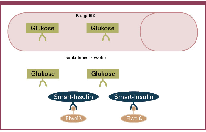 Derzeit werden verschiedene Technologien entwickelt, die eine glukoseabhängige Absorption von Insulin aus dem subkutanen Gewebe erlauben sollen. Bei diesen Insulinen liegt das Insulin an spezielle Trägereiweiße gekoppelt im subkutanen Gewebe vor. Lediglich bei ansteigenden Glukosekonzentrationen werden die Insulinmoleküle kompetitiv von ihren Trägereiweißen verdrängt und diffundieren anschließend in die Blutbahn (Abbildung 7). Mit dieser Technologie würden Insuline geschaffen, die in direkter Abhängigkeit vom Blutzucker ihre Wirkung entfalten. Diese Technologien befinden sich noch in frühen experimentellen Phasen, könnten aber die subkutane Insulinapplikation revolutionieren und zu einem Meilenstein auf dem Weg zur physiologischen Insulinsubstitution werden.