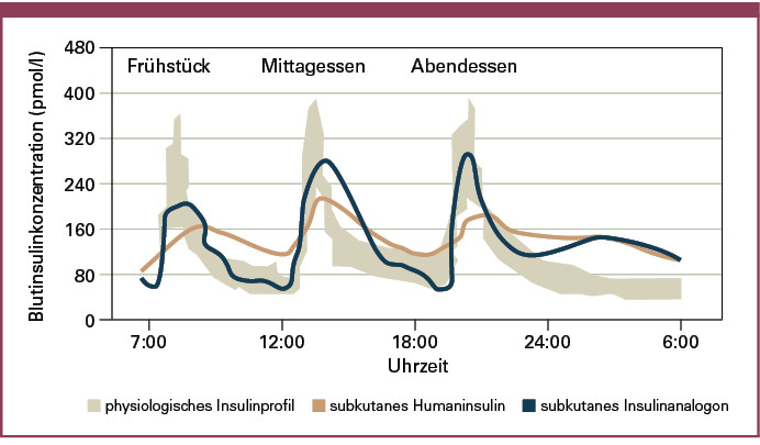 Insulinmoleküle liegen in hoher Konzentration (in der Ampulle oder dem Pen) in Form von Hexameren vor. Hierbei gruppieren sich 6 Insulinmoleküle um 2 Zinkatome. Nach subkutaner Applikation zerfallen diese Komplexe langsam zu Monomeren und freien Zinkatomen. Da lediglich Insulinmonomere die Gefäßwand penetrieren können, ist die Kinetik der Dissoziation der Insulinhexamere im subkutanen Gewebe der zeitlimitierende Schritt der Absorption aus dem subkutanen Gewebe. Die langsame Dissoziationsrate ist daher für die verzögerte und protrahierte Wirkung des Humaninsulins nach subkutaner Injektion verantwortlich. Durch eine Modifikation der Aminosäuresequenz bei den schnellwirkenden Insulinanaloga wurde die Neigung zur Selbstassoziation der Insulinmoleküle herabgesetzt und damit eine schnellere Absorption der Insuline aus dem subkutanen Gewebe erreicht. Somit wird durch die Verwendung schnellwirkender Insulinanaloga eine bessere Annäherung an eine physiologische prandiale Insulinkinetik erreicht (Abbildung 6).