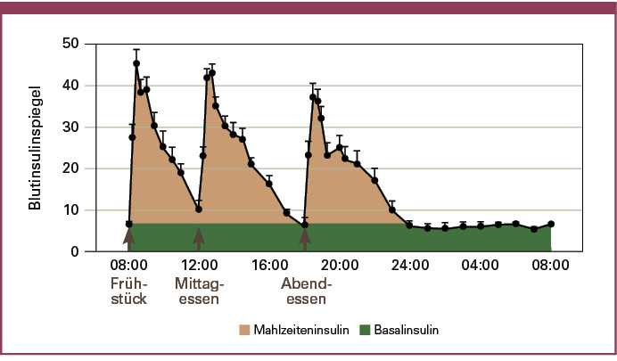 Seit Einführung der Insulintherapie durch Banting und Best im Jahr 1922 ist es das Ziel, eine möglichst physiologische Substitution des Hormons bei Patienten mit einem Diabetes mellitus zu erreichen. Unter funktionellen Aspekten kann hierbei zwischen einer basalen und einer durch Kohlenhydrataufnahme induzierten prandialen Freisetzung des Insulins nach einer Mahlzeit unterschieden werden. Der Insulinbedarf des Körpers in Phasen der Nahrungskarenz, ohne externe Kohlenhydratzufuhr, wird durch die Basalsekretion der Betazelle gewährleistet, während das nach einer Nahrungsaufnahme (postprandial) zusätzlich freigesetzte Insulin ein zu starkes Ansteigen des Blutzuckers nach einer Mahlzeit verhindert. Die enge Kopplung der basalen und prandialen Insulinfreisetzung aus der Betazelle an den aktuellen Blutzuckerspiegel erlaubt beim Gesunden die Stabilisation des Blutzuckers in engen Grenzen (Abbildung 1).