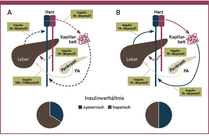 Ein weiterer Nachteil der subkutanen Insulinapplikation ist in der unphysiologischen Insulinverteilung im Körper zu sehen. Nach Sekretion des Insulins in die Pfortader gelangt dieses zunächst in die Leber und bedingt dort eine Hemmung der Glykolyse und der Glukoneogenese. Entgegen diesem physiologischen Weg des Insulins erfolgt die Absorption des Insulins aus dem subkutanen Gewebe überwiegend in die systemische Blutzirkulation (Abbildung 2). Unter physiologischen Bedingungen werden nahezu 40 bis 80 % des portalen Insulins bereits bei der ersten Passage in der Leber abgebaut und nur ein Bruchteil erreicht die peripheren Gewebe. Nach subkutaner Applikation des Insulins erscheint dieses jedoch zunächst in hoher Konzentration in der Peripherie, bevor es sekundär die Leber erreicht.