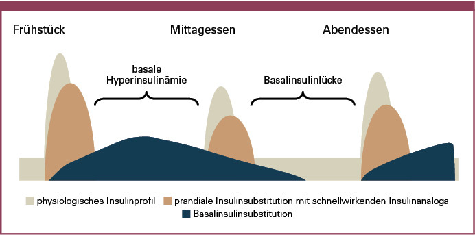 Verzögerungsinsuline zur Abdeckung des basalen Insulinbedarfs sollten eine lange und weitgehend konstante Wirkung aufweisen, um eine Suppression der nächtlichen hepatischen Glukosefreisetzung zu ermöglichen. Ausgeprägte Wirkspitzen sind unerwünscht und erhöhen das Risiko für Hypoglykämien. Neben einer sicheren Abdeckung des basalen Insulinbedarfs in der Nacht für Patienten mit Typ-1- und Typ-2-Diabetes ist für Patienten mit einem Typ-1-Diabetes eine zusätzliche zuverlässige Abdeckung des basalen Insulinbedarfs über den Tag von großer Bedeutung. Insbesondere bei Verwendung einer intensivierten konventionellen Insulintherapie (ICT) mit kurzwirksamen prandialen Insulinanaloga spielt eine optimierte Basalinsulinversorgung über 24 Stunden eine wichtige Rolle, um Hyperinsulinisierung einerseits und Basalinsulinlücken andererseits zu vermeiden. Insuline mit einer zu geringen Halbwertszeit bergen hierbei das Risiko von Hypoglykämien zum Zeitpunkt des Wirkmaximums und von einem Blutzuckeranstieg bei zu frühem Wirkverlust vor erneuter Injektion (Abbildung 3).
