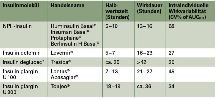 Ein weiteres Problem der Basalinsulinsubstitution ist in einer ungleichförmigen Wirkung und einer hohen intraindividuellen Absorptionsvariabilität verschiedener Basalinsuline zu sehen. Eine präzise Titration eines derartigen Basalinsulins mit hoher Absorptionsvariabilität gestaltet sich oft sehr schwierig und geht mit einem erheblichen Risiko für Hypoglykämien einher. Mit der Entwicklung neuer Basalinsuline sollten Insuline mit einer längeren und gleichmäßigeren Wirkung bei Reduktion der Absorptionsvariabilität geschaffen werden. Der Wirkmechanismus der derzeit zugelassenen Verzögerungsinsuline beruht auf einer Verlangsamung der Insulinabsorption aus dem subkutanen Gewebe und/oder der Bindung an Eiweiße wie Albumin. Hierbei kann eine Kopplung an andere Moleküle wie freie Fettsäuren oder Polyethylenglykol (Insulin detemir [Levemir®], Insulin degludec [Tresiba®] u. a.) oder/und eine Veränderung der Primärstruktur der Insuline (Insulin glargin [Lantus®, Abasaglar®], Insulin detemir [Levemir®], Insulin degludec [Tresiba®]) zum Einsatz kommen. Ein Überblick über die derzeit in Europa zugelassenen Basalinsuline gibt Tabelle 1.